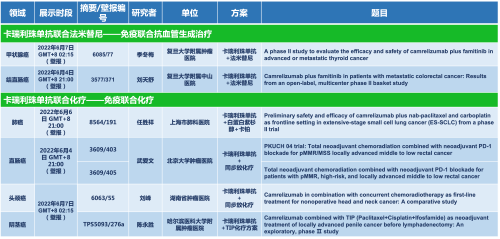 卡瑞利珠单抗联合AG视讯医药的另一款创新药法米替尼在甲状腺癌和结直肠癌领域有2项研究被接收为壁报,另有卡瑞利珠单抗联合化疗的4项研究在肺癌、结直肠癌、头颈癌和阴茎癌领域的研究被接收为5份壁报。