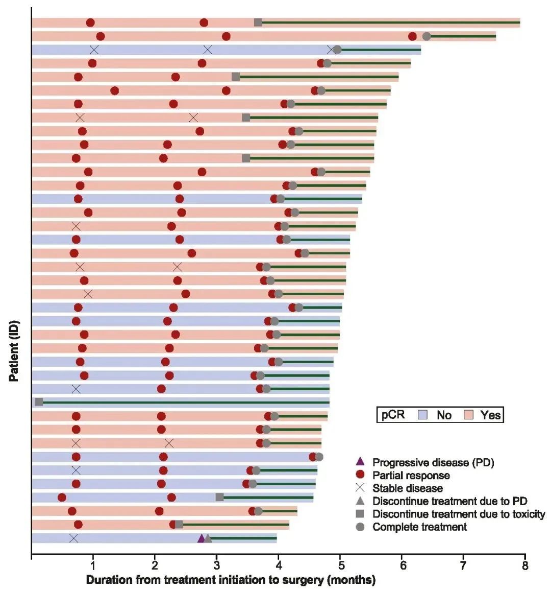 本研究采用Simon二阶段设计,第一阶段纳入9例患者,其中8例患者达pCR(88.9%),第二阶段继续纳入30例患者,最终25例患者达pCR(64.1%,95%CI:47.2,78.8)。其中在PD-L1阳性(PD-L1≥1%)的人群中pCR率达91.7%(11/12),在PD-L1阴性人群中pCR率为40.9%(9/22)。